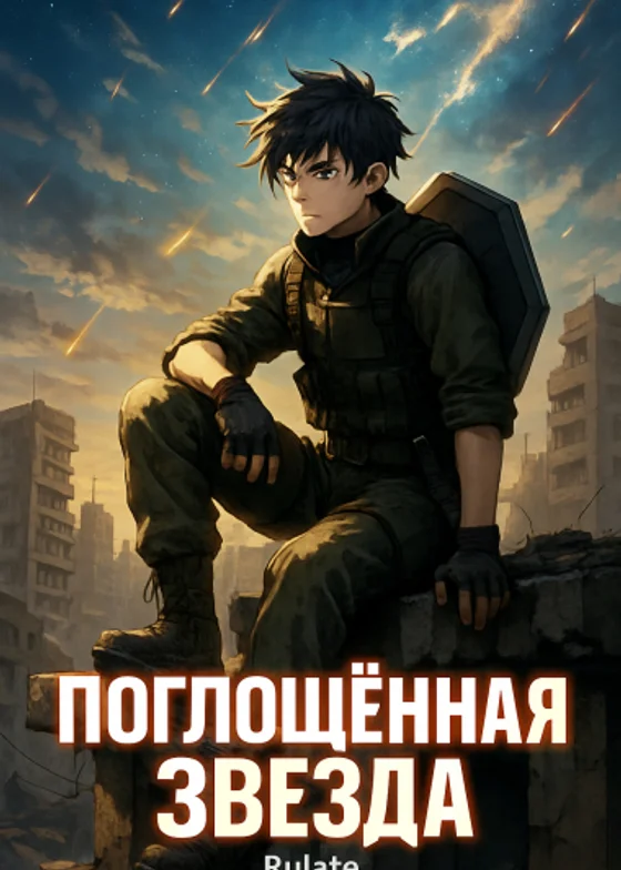 На вершине разрушенного шестиэтажного здания сидит подросток в боевом жилете, военных штанах и сапогах. На спине у него висит шестиугольный щит, на поясе висит военный нож. В это же время в сияющих небесах мелькают искры, свежий ветер дует в лицо подростку.